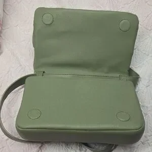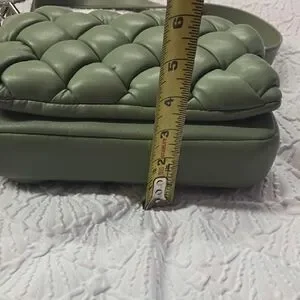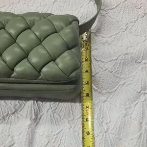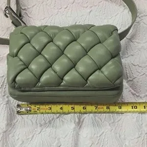 Stylish olive green crossbody with woven design. Adjustable strap, soft close, supple vegan leather. Small imperfection shown in last photo. Comes with dust cover.
