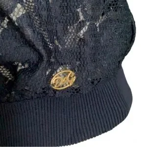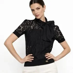 Features an elegant scarf-tie bow neckline, sheer floral lace construction, and ribbed cuffs and hem finished with a gold-tone D&G logo plaque.