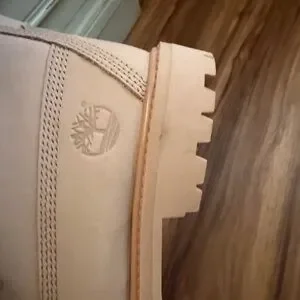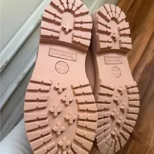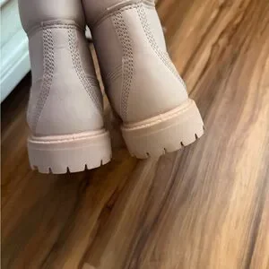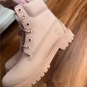 Timberland women's lace-up boots in a blush pink tone. Sturdy lug sole for reliable traction. Padded collar for added comfort. Classic embossed Timberland logo on the side.