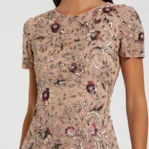 Mac Duggal Mocha Beige Floral Embellished Short Sleeve Midi Dress