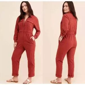 Introducing the Free People Set The Tone Collared Neckline Long Sleeves Snap Cuffs Jumpsuit in size 0. This stylish one-piece outfit features a collared neckline, snap closure, and long sleeves with snap cuffs. Made from a blended fabric, it is perfect for various occasions including travel, parties, and casual wear. The jumpsuit has an elastic waist, pockets, and is breathable, making it comfortable for all-day wear. With its relaxed fit and straight leg style, this jumpsuit embodies a trendy and bohemian vibe, ideal for summer, fall, and spring seasons. Machine washable for easy care, this orange jumpsuit is a must-have addition to any woman's wardrobe.