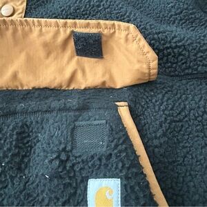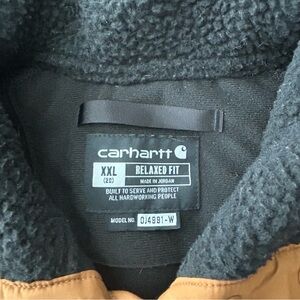 Thick black sherpa lining around the hood and neck. Exterior shows brown workwear fabric trim. Interior label with Carhartt logo. Rugged, casual style.