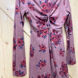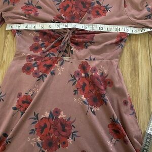 Elegant dusty pink dress with red floral design. The color is a brown mauve. Features long butterfly sleeves and ruched front bow. This dress is a perfect western-costal-bohemian style. The fabric is soft and light weight! Perfect for Spring, Summer, and Autumn. This dress pairs well with boots, and wedges! It has a slight fit and flare to it.