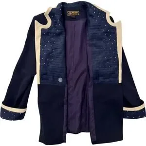 Good pre-owned condition with light general wear consistent with prior use. Some light lint visible and minor signs of wear around the buttonholes and fabric consistent with age. No major structural flaws noted; embellishments appear intact and lining is clean. Natural fabric texture and gentle wrinkling may be present, and any noted flaws are shown in photos; please review photos for additional details.