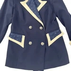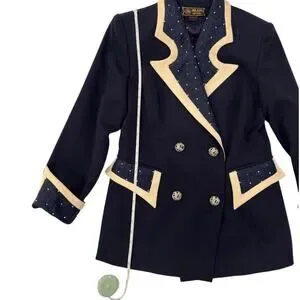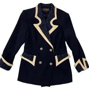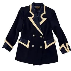 Vintage Milano High Fashion navy double breasted blazer with pearl stud embellishments, sculpted contrast lapels, pleated trim panels, statement buttons, tailored waist, and structured military inspired silhouette perfect for vintage power dressing, royalcore, and maximalist styling.