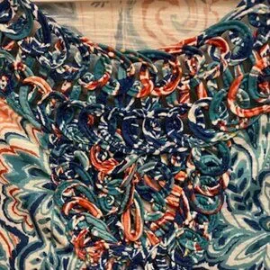 Ruby Rd summer top NWT. Shades of blue and green, curved hem. Textured neckline. Pettie large