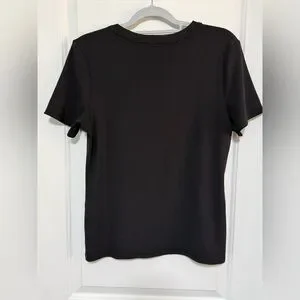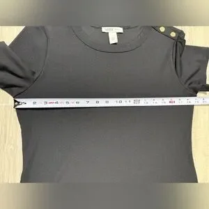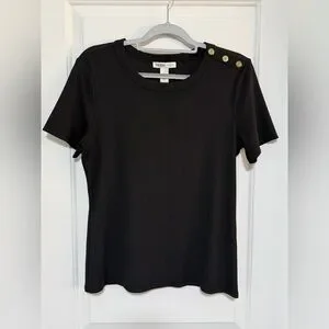Sleek black ribbed tee with stylish shoulder buttons. Ideal for versatile wear.