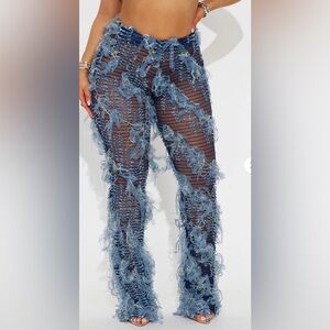 Unique blue fringe pants perfect for the beach or a bold fashion statement. Great stretch 60% Polyester, 40% Spandex. 32” inseam