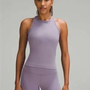 Stylish lavender athletic tank top. Features a high-neck design. Perfect for workouts or casual wear.