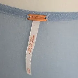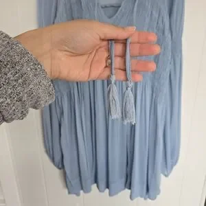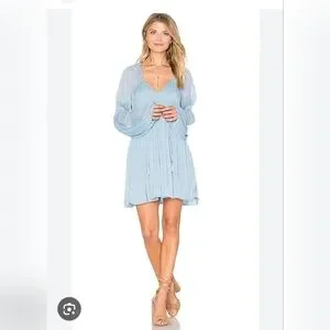 Free People dress. Super lightweight chiffon. V-neck. Shirred elastic panel. Puffed sleeves. Layered design. Loose pleats. Regular fit - true to size. Shell: 100% nylon. Lining: 60% rayon, 40% cotton. Fully lined. Front tie closure with tassels. Shirred bodice and sleeve trim.