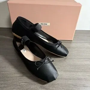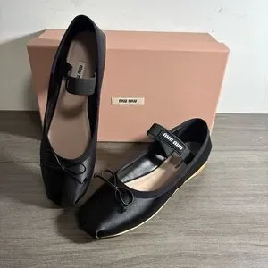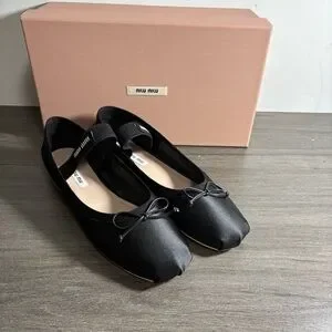Miu Miu Black Satin Square-Toe Ballet Flats with Elastic Strap and Bow