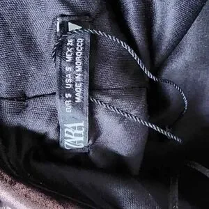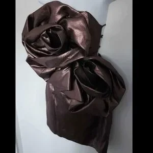 Sculptural mini dress by Zara. Metallic chocolate brown sheen fabric. Dramatic oversized rose detail at the bodice. Feminine and statement-making. Perfect for evening wear.