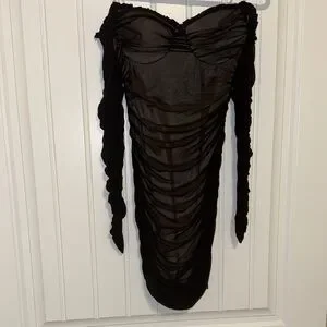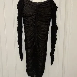 Elegant black mini dress. Features ruched design. Off-shoulder style. Perfect for a night out.
