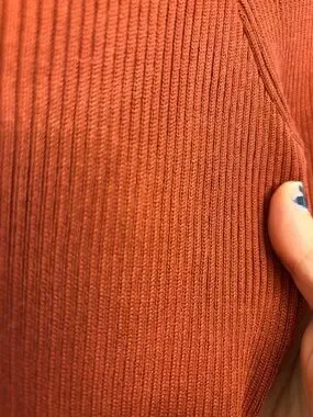 Flattering ribbed bodycon silhouette in a warm rust tone. Soft knit fabric offers comfortable stretch and a sculpting fit. Sweetheart neckline with gathered center adds subtle detail. Versatile long sleeves for seasonal wear. Polyester blend. Stretch.