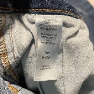 Dark wash skinny jeans with light distress accents. Slim, tapered leg for a flattering fit. Classic five-pocket denim style for everyday wear. Bundle - 2 pair - Size 16W. Wash wear only. One pair is missing size tag. Exact same pair of jeans.