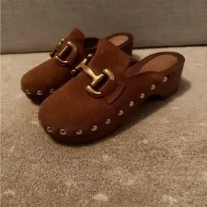 Boden Brown Suede Studded Clog Mules with Gold Bit