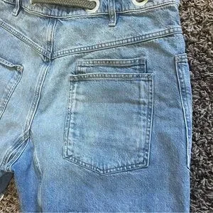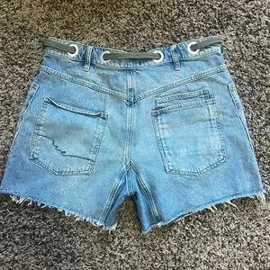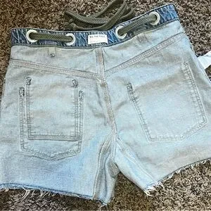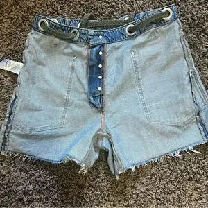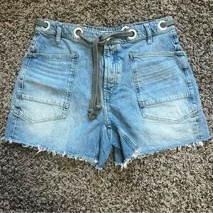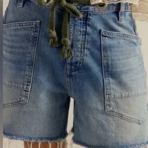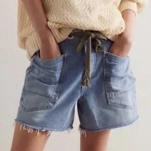 Light blue denim shorts with large front patch pockets and a relaxed fit. Frayed hem for a casual, on-trend look. Easy, comfortable style that pairs well with tees or tanks. Free People fan favorite!
