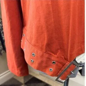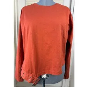 Stylish Zara top blouse in a rich burnt orange tone. Features long sleeves and a unique buckle belt detail at the hem that creates a structured, fashion-forward silhouette. Soft fabric with a relaxed fit while the buckle detail adds shape and visual interest. A standout piece that pairs well with high-waisted jeans, trousers, or skirts.