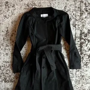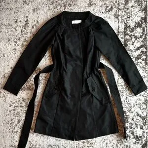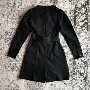 Classic black women's trench coat with a removable belt. Features pleated neck detail, hidden front buttons, buttoned flap pockets and back vent. Medium weight, wrinkle resistant.