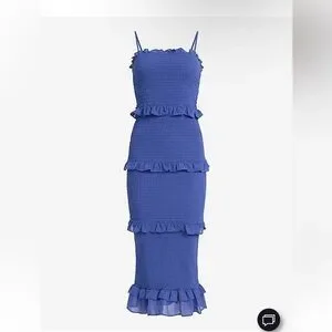 Chic blue midi dress with ruffle details. Sleeveless design. Perfect for any occasion.