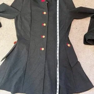 Military inspired design, stand up collar, cuffed sleeves. Charcoal grey with red accents