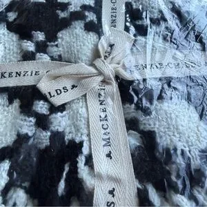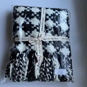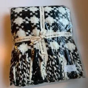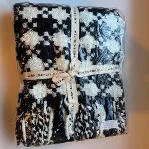 Classic houndstooth patterned throw by MacKenzie-Childs. Soft woven texture with fringe edge. The throw has never been opened. The plastic has been opened to take pictures.