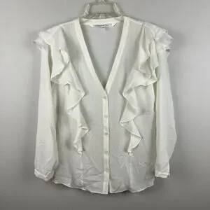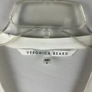 Discover this lovely Veronica Beard ivory ruffle shoulder blouse, a stylish addition to your wardrobe! This beautiful top, sized 8, features charming ruffle details that add a touch of elegance and sophistication to any outfit. Made from quality fabric, it offers a comfortable yet chic look.