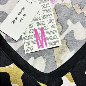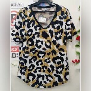 Stylish leopard print V-neck top in black, tan and white. Soft, breathable fabric with a relaxed fit for everyday comfort. Versatile design that pairs well with jeans or skirts. Bold animal print adds instant style to any outfit.