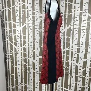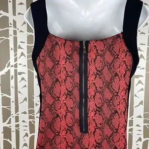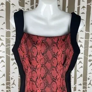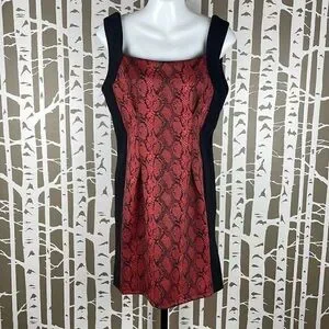 Sleek red snake-print sheath dress with slimming black side panels. Square neckline and wide straps create a flattering silhouette. Bold red pattern adds modern edge for evening or special events. Easy to style with heels and minimal accessories.