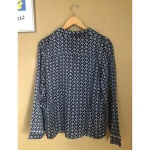 You won't want to take off Quince's luxurious 100% Washable Silk Satin Pajama Long Sleeve Top. Made from 100% Mulberry silk in a satin finish. It is decadently soft, breathable and comfortable for sleeping or lounging, alike. Navy blue with a white geometric pattern. Center front placket with button closure. Contrast piping finish. 100% silk, machine washable. Size small, fits true to size. See the last pic for a size chart. New with tags and flawless!