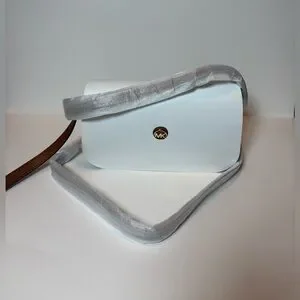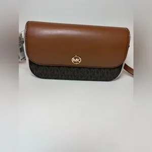 Michael Kors crossbody with signature MK jacquard base. Smooth brown leather flap with gold MK emblem. Compact silhouette with detachable strap. Refined two-tone look for everyday wear. NWT!!