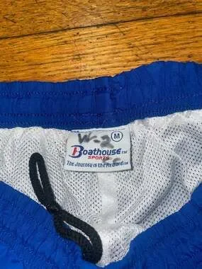 Vintage Boathouse Sports Mesh Lined Windbreaker Pants in Royal Blue, Size Medium. These classic athletic pants are Made in the USA and feature a durable nylon shell with a breathable polyester mesh lining. Ideal for training or casual sportswear.