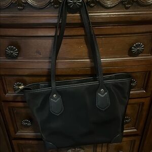 Sleek black tote with leather accents. Ideal for daily use. Features sturdy handles and secure closure.