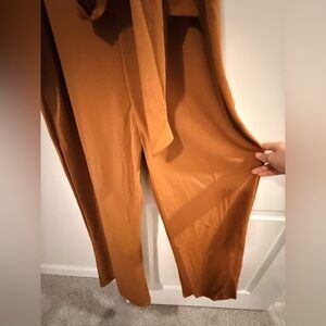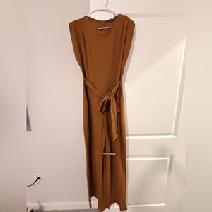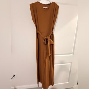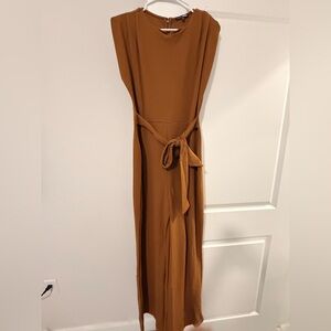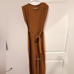 Elegant sleeveless jumpsuit with a self-tie waist for a flattering silhouette. Smooth, drapey fabric and clean lines create a polished, versatile look. Perfect for daytime or evening wear in a warm caramel brown.