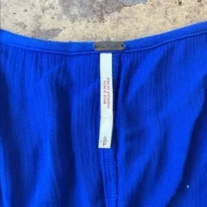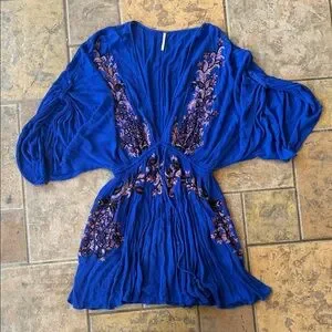 Elegant royal blue dress with intricate floral embroidery. Features a plunging neckline and relaxed sleeves.