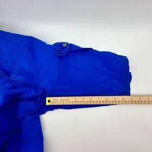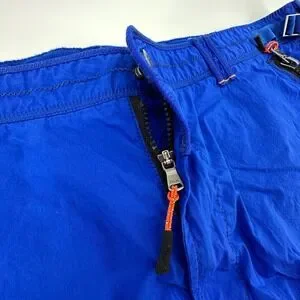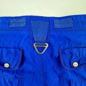 Vintage RLX Ralph Lauren cargo shorts in a vibrant cobalt blue feature a technical slim-fit design crafted from a durable cotton-nylon blend. These utility-focused shorts are equipped with multiple functional pockets, including two large front cargo pockets with snap closures and two diagonal zippered pockets with high-contrast black zippers and orange pull cords. The waistband is adjustable with side metal buckles for a customized fit, and the piece is finished with signature RLX hardware and a secure button-and-zip fly.
