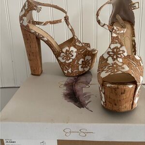 High platform sandals with cork-covered heel. White floral print over tan upper. Ankle strap with buckle for secure fit. Bold platform for a statement look.