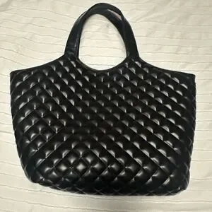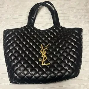 Chic black quilted tote. Features iconic gold logo. Stylish and versatile.
