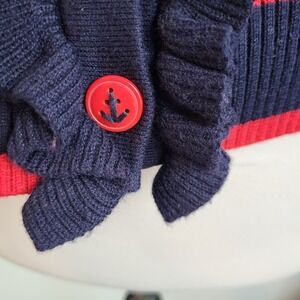 Nautical-inspired cardigan crafted from a soft cotton blend with a touch of cashmere for a luxurious feel. This navy blue sweater features a charming ruffle trim along the button placket, accented by bright red buttons embossed with anchor details. Contrasting red stripes at the hem and cuffs add a classic preppy touch, while two small front pockets provide functional detail. The round neckline and button-front closure make it a versatile layering piece for a polished, maritime-inspired look.