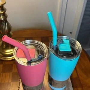 Set of Hydraflow Capri 20 oz cups with metal straws and soft cover over straws. Cups are triple wall vacuum insulated with copper lining. Keeps beverages cold up to 12hrs and hot up to6 hrs. Fits in cup holder dual lid for straw and sipping. NWT. One cup is coral and the other is turquoise.