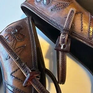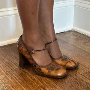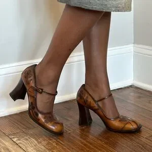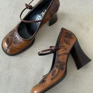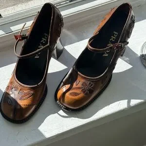VINTAGE 1999 PRADA LEATHER FLORAL MARY JANE HEELS