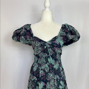 Free People Sundrenched dress, floral maxi dress, navy blue green print, size medium, off shoulder puff sleeve dress, boho tiered maxi, summer festival dress, vacation resort wear, romantic flowy silhouette, smocked bodice dress, feminine cottagecore style