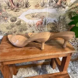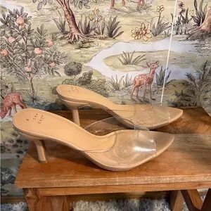 Chic clear strap mules with tan heels. Versatile and stylish for any outfit.
