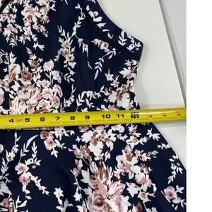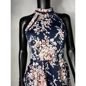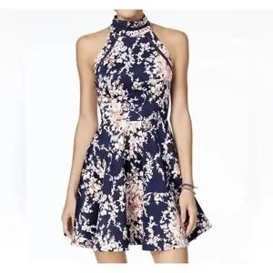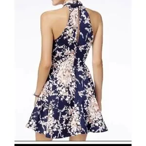 B. Darlin floral fit and flare dress in a navy blue, pink, and white color palette. This sleeveless design features a high halter-style neckline with delicate crochet trim detailing and a keyhole back with a zipper closure. The skirt has a flattering pleated skater silhouette, and the fabric is a comfortable polyester blend with a hint of spandex for stretch.