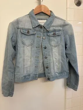 Light blue denim jacket with a timeless trucker silhouette. Features button-front closure and chest flap pockets for practical style. Soft, faded finish pairs easily with casual outfits. Designed for everyday wear and layering. Buttons have brand name on them - I love this!
