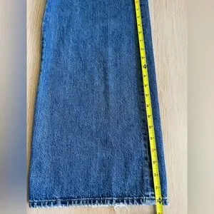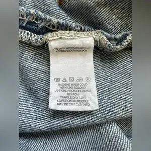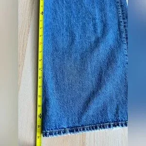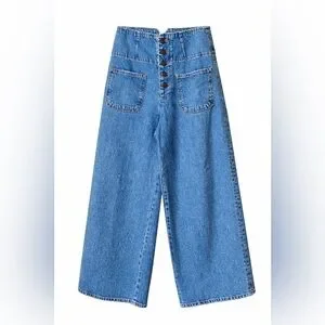 Vintage-inspired design with button fly closure and large front patch pockets. Structured denim with a flattering high-waist silhouette and wide leg cut.