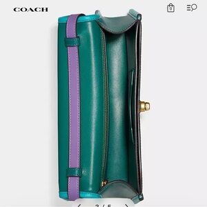 Coach leather satchel with bold colorblock panels. Turn-lock closure and branded hangtag. Single top handle for easy carry.