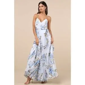 A lifetime of love is surely in store when you make the Lulus Oh-So Romantic Pale Blue Floral Print Sleeveless Wrap Maxi Dress your plus-one! This event-ready gown starts with an airy chiffon construction (decorated with a blue and green floral print) that shapes an overlapping bodice, adjustable spaghetti straps that crisscross at back, and a high wrapping waist with two sets of ties. A-line silhouette trails into a lovely maxi hem.