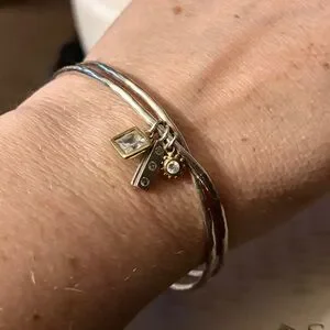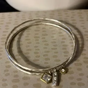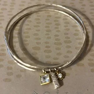 Stylish Silpada sterling silver double bangle bracelet featuring three sparkling charm accents. This elegant piece combines hammered sterling silver bangles with mixed-metal charm details for a modern layered look.