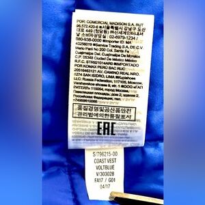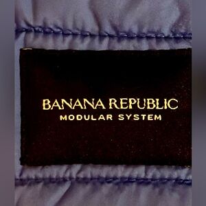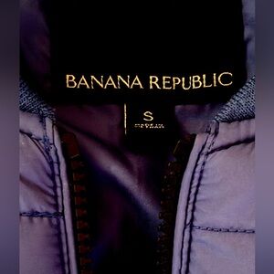 This is a Banana Republic men's blue puffer vest with a bomber-style knit collar and zip closure. Great vest for layering.